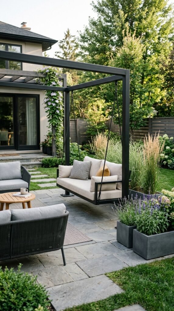 Place the swing underneath with light cushions and lantern lighting nearby. The result feels romantic and peaceful. This is a favorite choice for homeowners who want elegant backyard styling with a relaxing seating area.