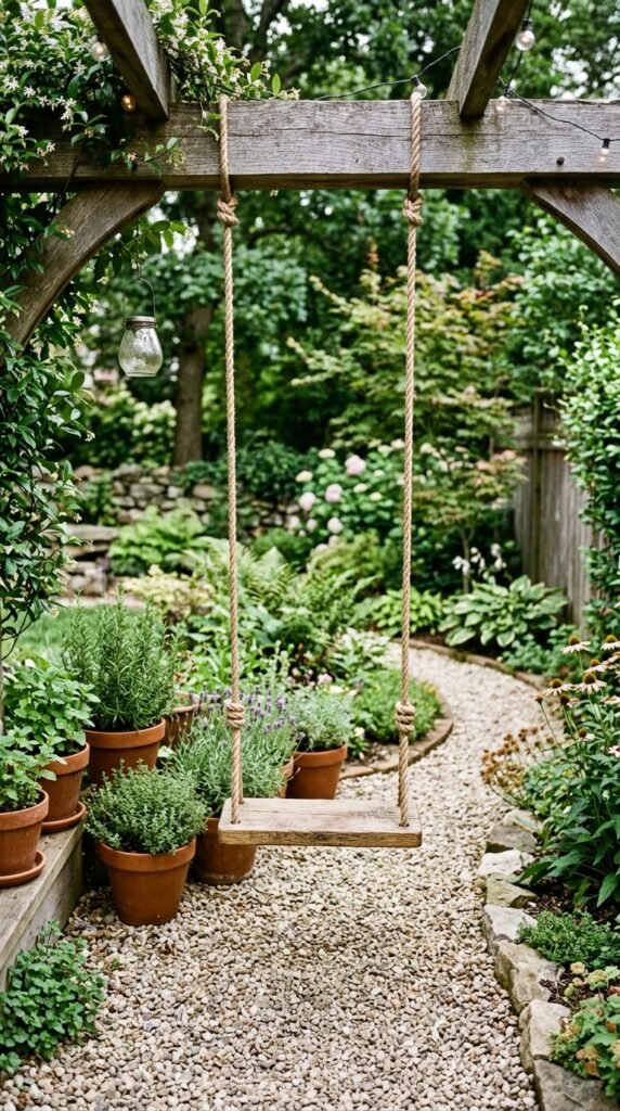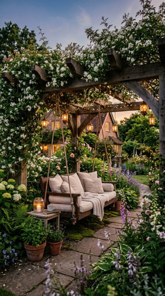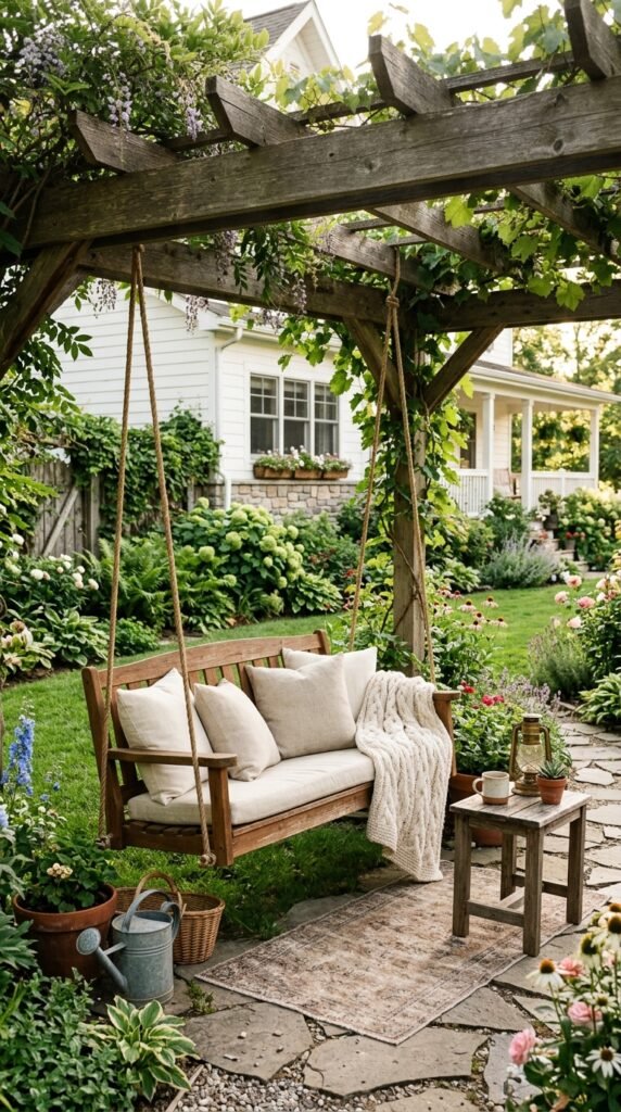 A pergola swing setup is one of the most stylish ways to anchor a seating area in the garden. The pergola frame creates structure while the swing becomes the centerpiece.