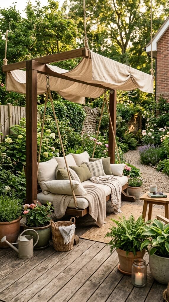 Add large cushions, soft blankets, and outdoor pillows to make it feel like a mini outdoor daybed. This setup works beautifully in larger gardens and instantly upgrades patio decor.