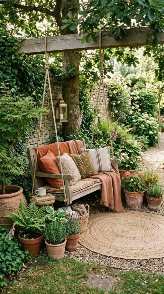 Place the swing in a quiet corner of the garden and style it with earth tone cushions, jute rugs, and terracotta planters. The layered textures make the space feel cozy without trying too hard. Many people choose this option for small garden decor because it adds personality without taking up too much space.