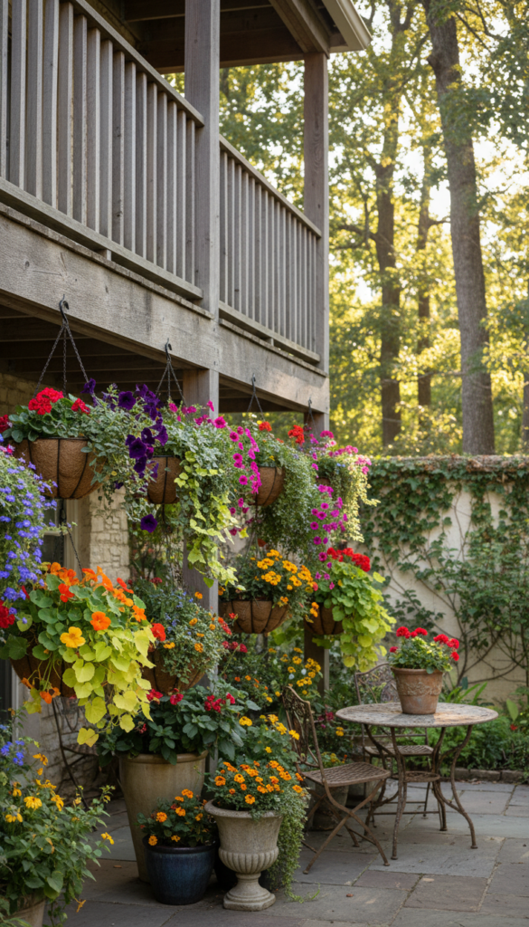 These baskets don’t just float there — think living art. Mix textures, play with color contrasts, and let some vines trail down to make your balcony or backyard feel dreamy. Hang them at staggered heights so your eye travels like it’s on a kind of garden rollercoaster.
