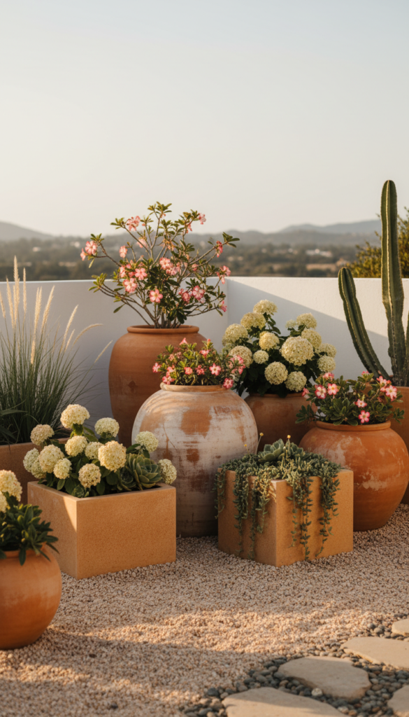 This idea pulls back clutter and lets the blooms speak for themselves. Choose a few signature flowers and pair them with urns or pots in earthy finishes. Terracotta pairs beautifully with citrus blossoms or deep green foliage for that rich but calm aesthetic.