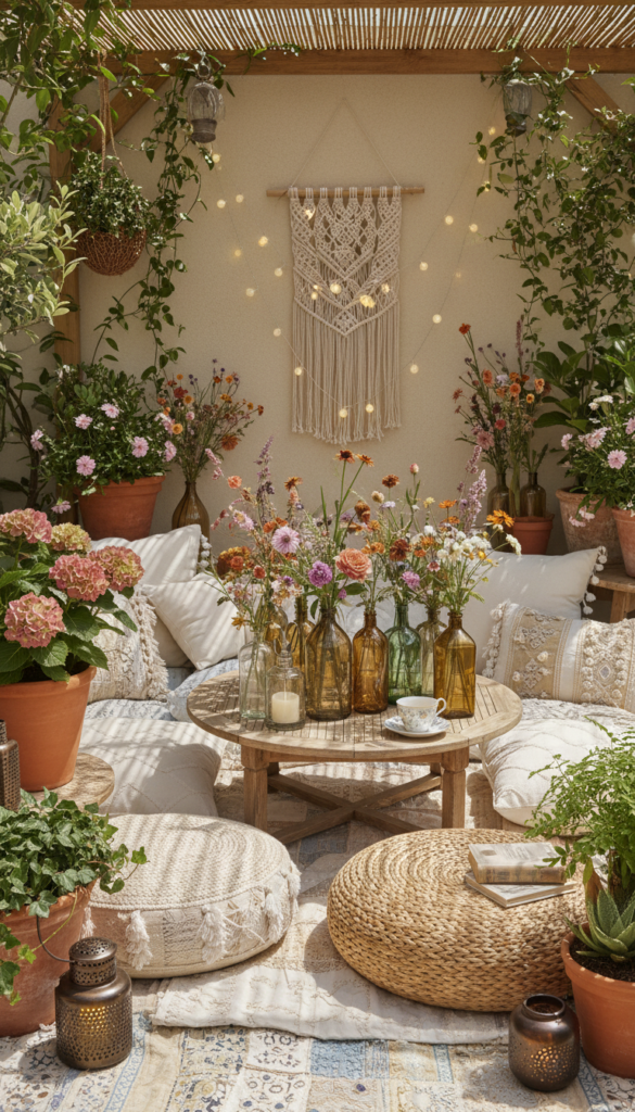 Soft textures, layered fabrics, and mixed planters make the whole corner feel like a flower-wrapped lounge station. Ideal for lazy afternoons or tea time outdoors. Bonus points if you add small lanterns or solar lights for nighttime magic.