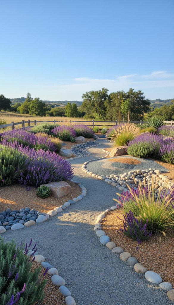 Plant drought-tolerant blooms like lavender, rosemary, and hardy salvias next to artistic gravel beds and river rocks. Not only does this look chic, it cuts down on watering stress and gives your outdoor space a modern, sustainable glow.