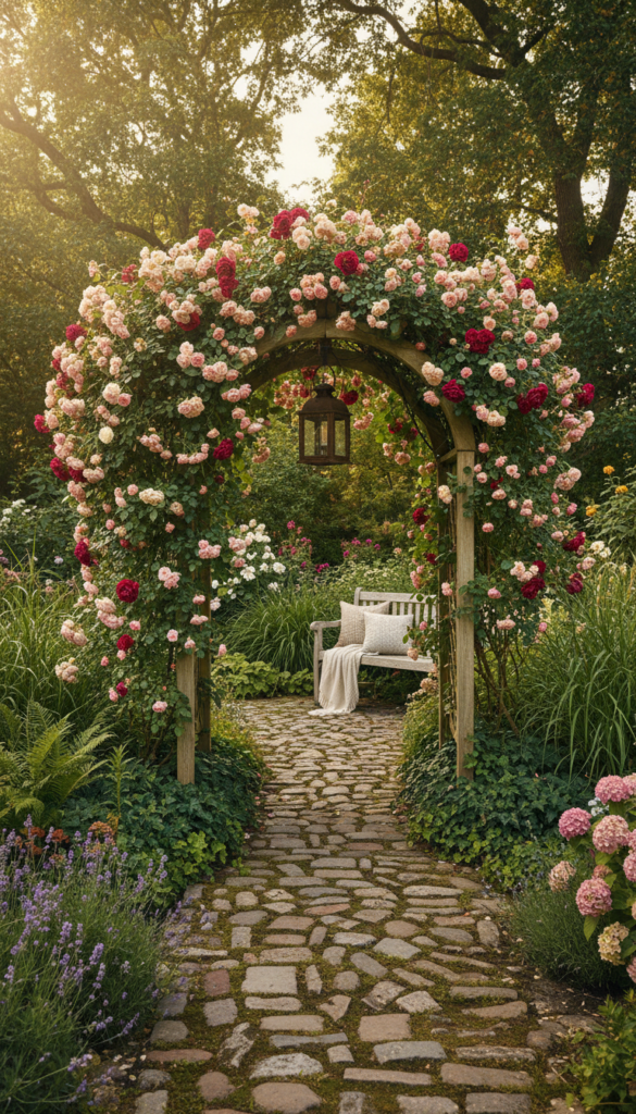 Place an arch at an entry point or along a pathway. Train climbing roses, jasmine, or ivy over it for a romantic effect. Vertical elements draw the eye upward and add elegance.