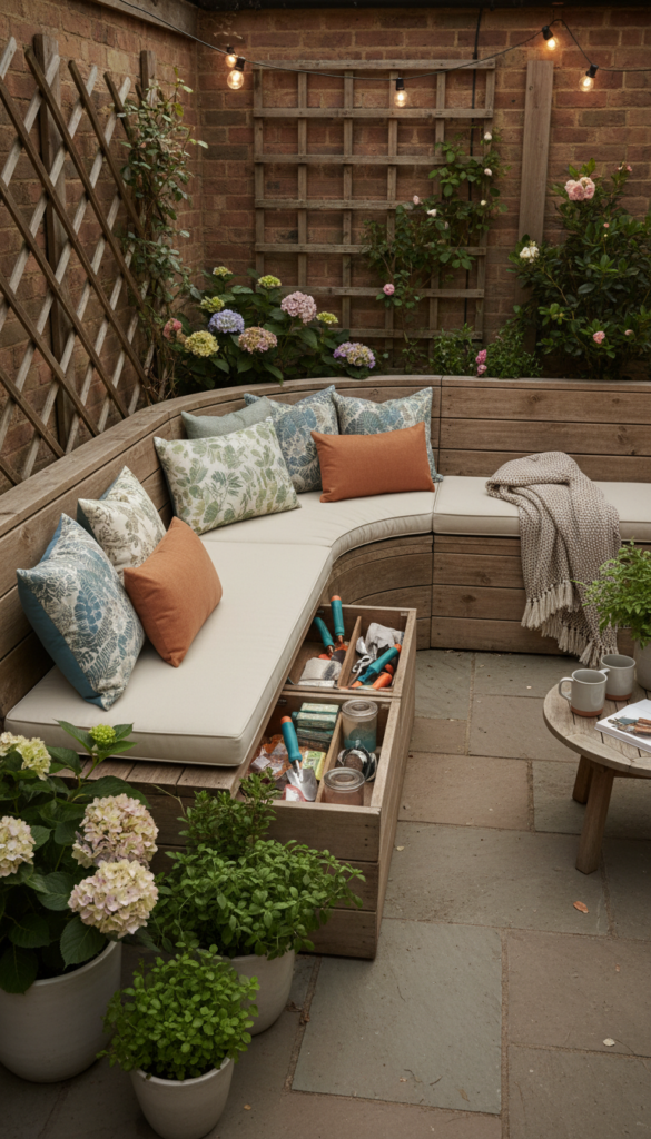 Choose wood for warmth or painted finishes for a crisp feel. Add thick cushions in neutral tones and a few patterned pillows for personality. Hidden storage keeps tools and blankets tucked away.