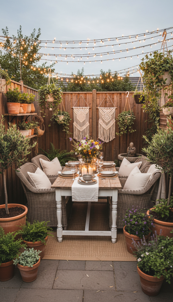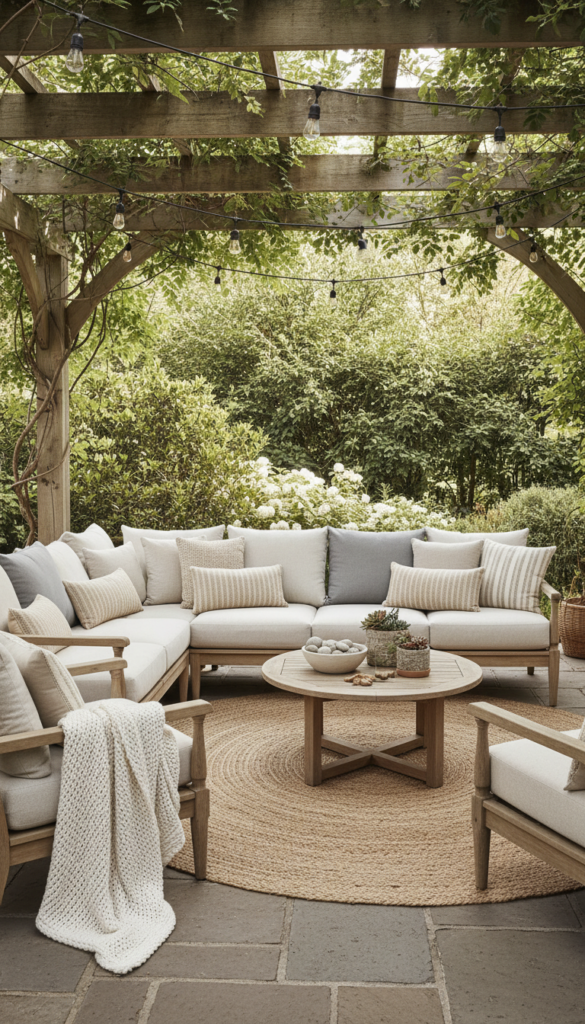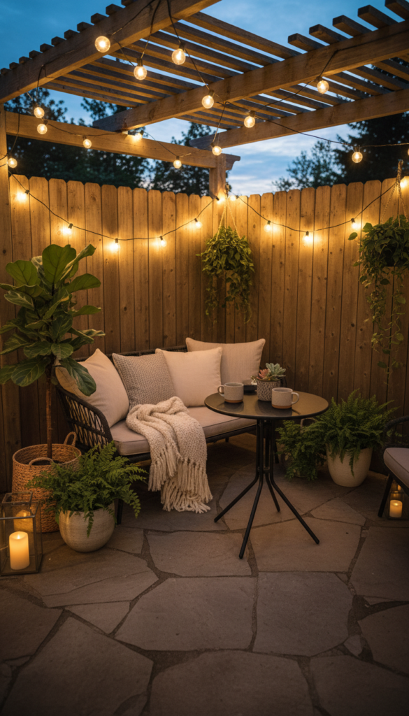 Drape lights along a fence, wrap them around a pergola, or zigzag them above a seating area. Pair them with neutral outdoor cushions and a textured woven throw to amplify the warmth. Always choose warm white bulbs over cool tones for a more inviting look.