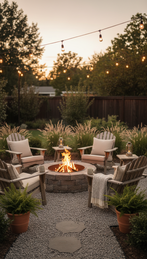 People love fire pit setups because they extend outdoor time into cooler evenings. It becomes the heart of your garden decor ideas.
