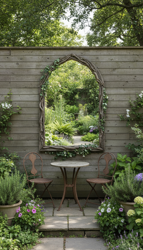 Hang an arched mirror on a fence where it reflects plants instead of clutter. Choose weather resistant frames in black or distressed wood. Positioning matters more than size.