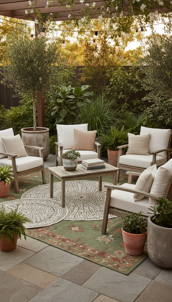 Choose weather resistant materials in earthy tones or subtle patterns. For extra depth, layer a smaller patterned rug over a neutral base. Layering adds texture and makes small garden decor feel intentional.