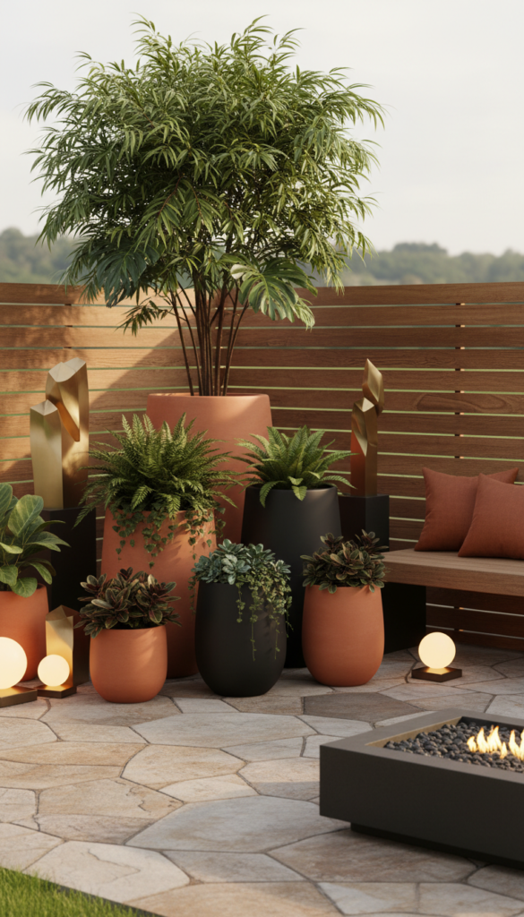 I personally love terracotta for warmth, but matte black looks sleek in modern patio decor. Cluster planters in odd numbers and vary the heights for a curated look. Bigger containers make plants look intentional, not accidental.
