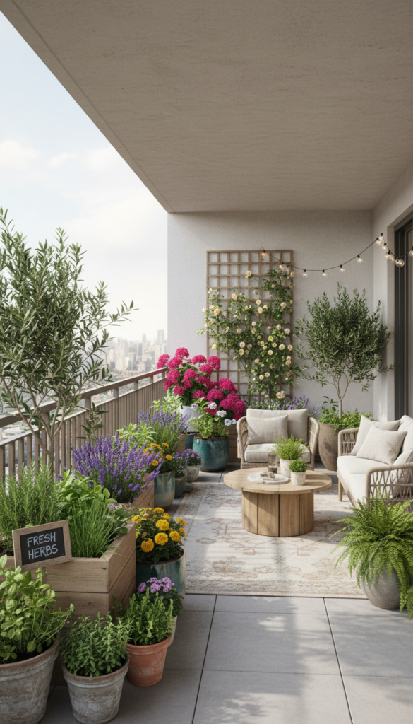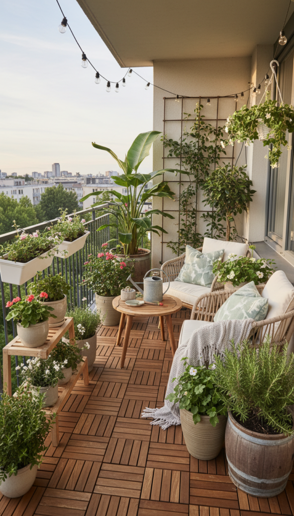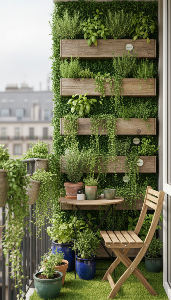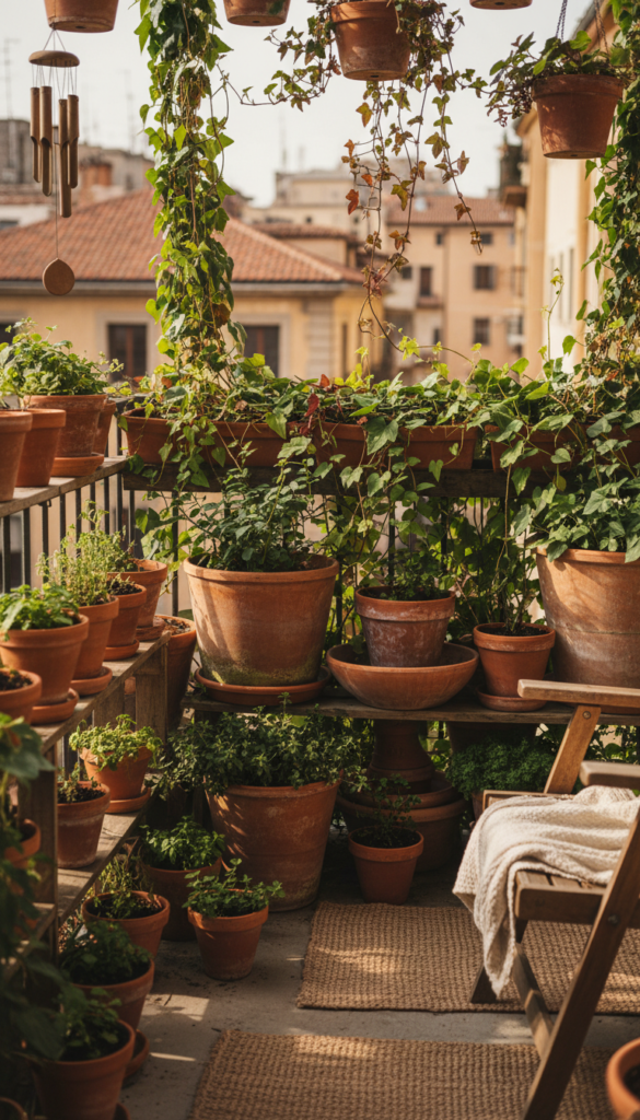 If floor space is tiny but your plant dreams are big, a vertical garden is your new BFF. Think wall-mounted planters stacked up like living art — herbs at one level, trailing vines gently flowing below. This takes advantage of the empty vertical real estate, making your tiny balcony feel higher and greener without cluttering the floor. Pair with clay and ceramic pots that mix textures for that curated look you see on Pinterest.