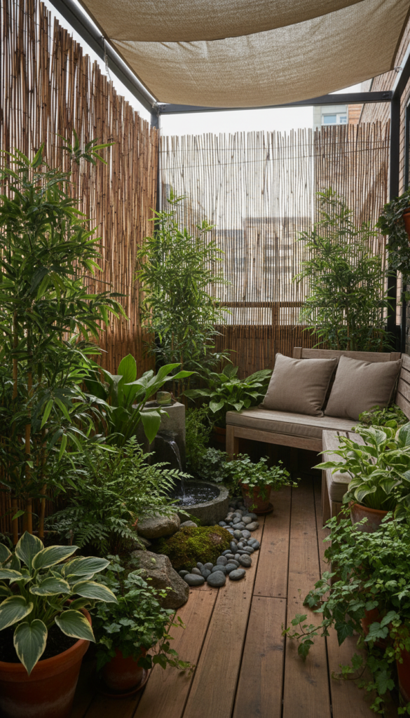 Not every balcony gets full sun, and that’s okay! Use shade-loving plants like ferns, hostas, or bamboo palm to create a calm green retreat. Pair with muted pots and bamboo screens for privacy and a peaceful vibe. (Balcony Garden Paradise)