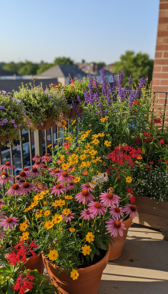 Your balcony can help the local bees and butterflies too. Create a mini pollinator paradise with coneflowers, salvia, and native blossoms that attract winged guests. (Balcony Garden Paradise)