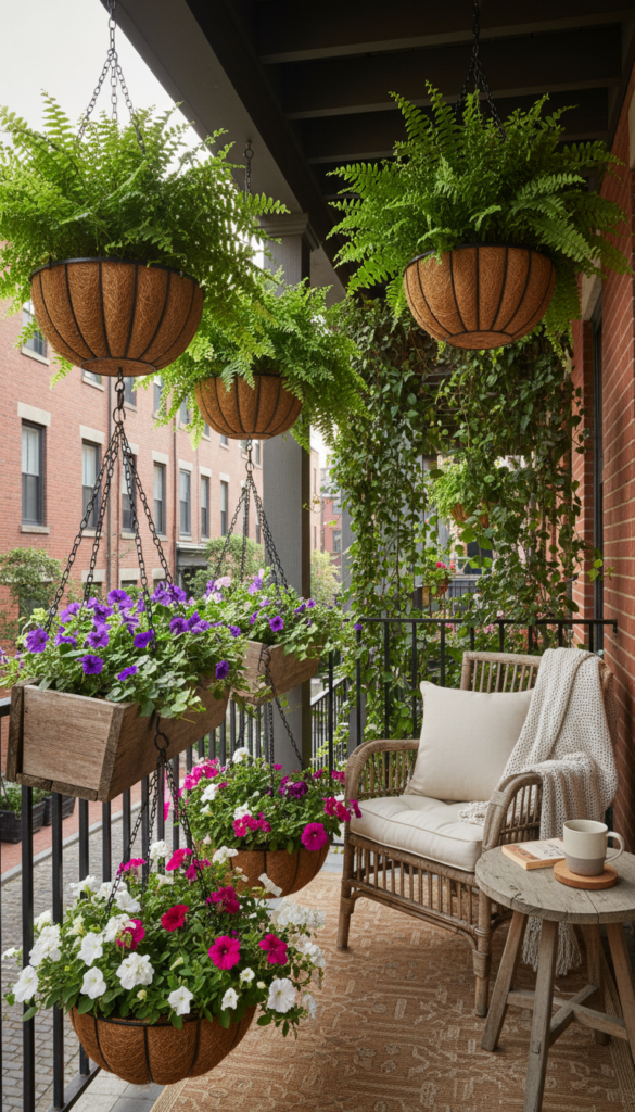 Hanging baskets are like the jewelry of balcony garden decor — they add movement, color, and depth with zero precious floor usage. Whether you go for Boston ferns, ivy, or petunias, the cascading foliage turns edges into a soft, living frame. Hanging at different heights gives dimension like those cozy outdoor cafes.