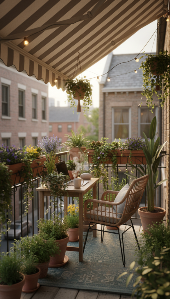 Think lightweight furniture and soft shade solutions (like a small patio umbrella) so it’s comfy even midday. This idea makes your balcony functional and stylish — perfect if you’re mixing office hours with nature breaks.