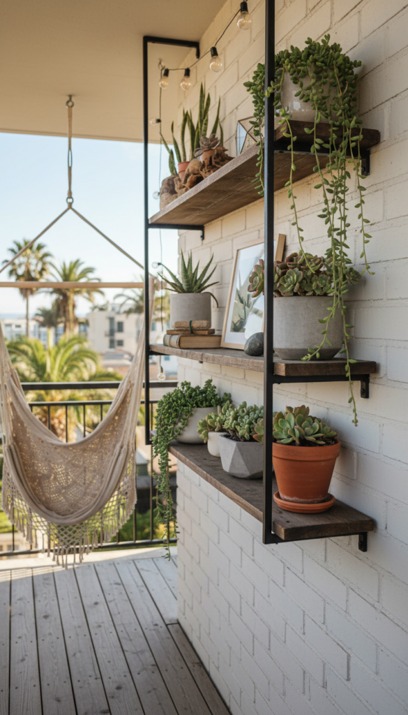 Go for wood or metal shelves that match your aesthetic, and layer with plants of different sizes. This makes even balcony lighting feel intentional and stylish. Plus, visitors get that “wow” moment when they spot how thoughtful and layered your styling is.