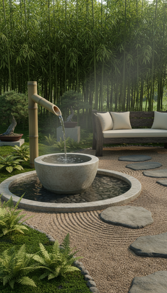 Craving a calming corner you can actually sit in? A bamboo zen fountain brings that peaceful garden retreat vibe into real life. Inspired by Japanese water gardens, this simple spout and basin combo feels meditative every time you walk by. Surround it with gravel, smooth stones, and low ground covers to enhance that tranquil feel. Folks who go for this say it instantly makes their space feel intentional and relaxing — perfect for quiet mornings or evening wind-downs. (PlusMood)