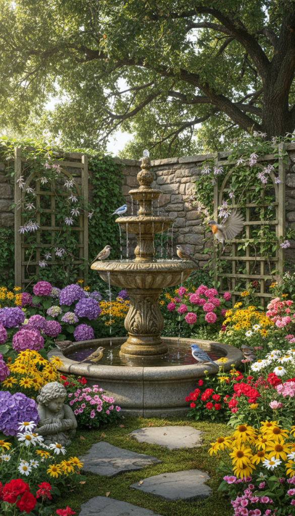 Last but not least, a birdbath fountain is perfect for smaller yards or garden corners that need life. Combining a shallow birdbath with flowing water attracts birds and adds that lively, immersive garden experience. It’s one of the simplest garden decor ideas that delivers double the joy — watching wildlife and enjoying water sounds. Pair it with flower borders and a comfy chair nearby, and suddenly your morning coffee spot becomes a thing. (godiygo.com)