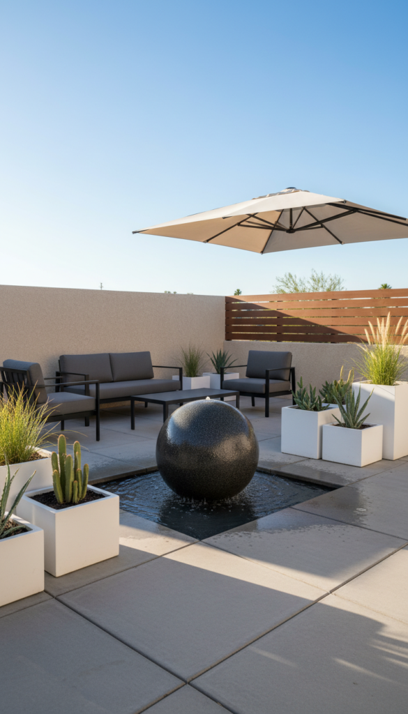 If your style leans modern, consider a granite sphere fountain — sleek, dramatic, and surprisingly calming. Water cascades over a smooth stone sphere, giving off minimalist, effortless charm. This falls under modern outdoor decor ideas that still feel cozy rather than cold. Perfect for a clean patio or courtyard, pair it with linear planters or geometric seating to keep the vibe consistent. Fans of this style say it’s the punchy focal point their space needed — bold, simple, and endlessly cool. (milorien.com)