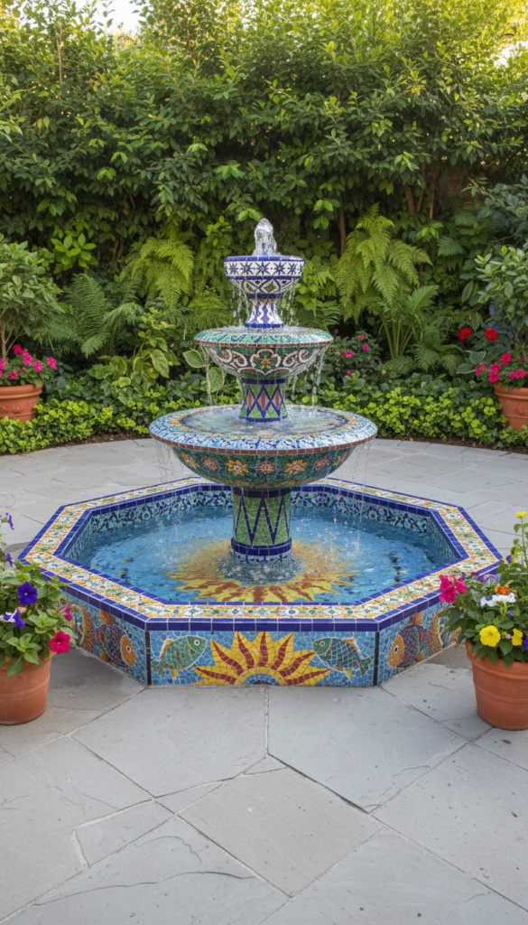 Want garden decor that stops traffic? A glass tile mosaic fountain is your drama piece — vibrant colors, reflective surfaces, and artistic flair make this a standout. Think Moroccan or Mediterranean patterns with sun catching every facet. Whether wall mounted or floor standing, it adds huge visual appeal. Pair with neutral landscaping so the fountain truly shines. People are obsessed with this because it feels custom and artistic without needing a giant budget. (Ideal Home)