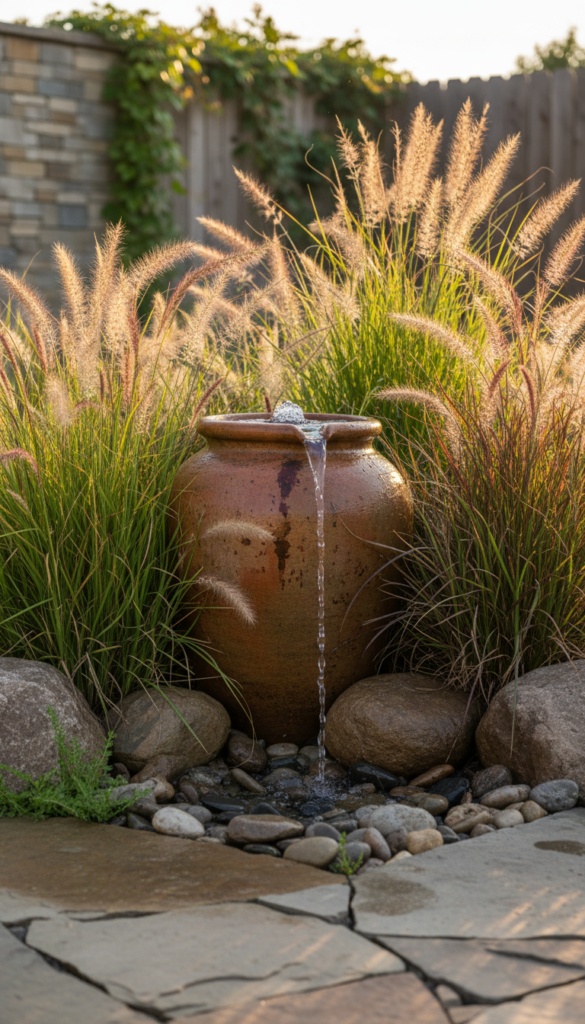 There’s something about rustic clay pot fountains that feels just right in a garden setting. Earthy tones, simple shapes, and that subtle bubbling sound make these pieces natural complements to flowers and shrubs. You can position one on a patio table or nestled next to tall ornamental grasses for a relaxed, organic aesthetic. These play beautifully with natural texture — terracotta, wood, and stone all sing together in this setup. The vibe? Casual, comforting, and totally approachable even if you have zero design experience. (Garden Eros)