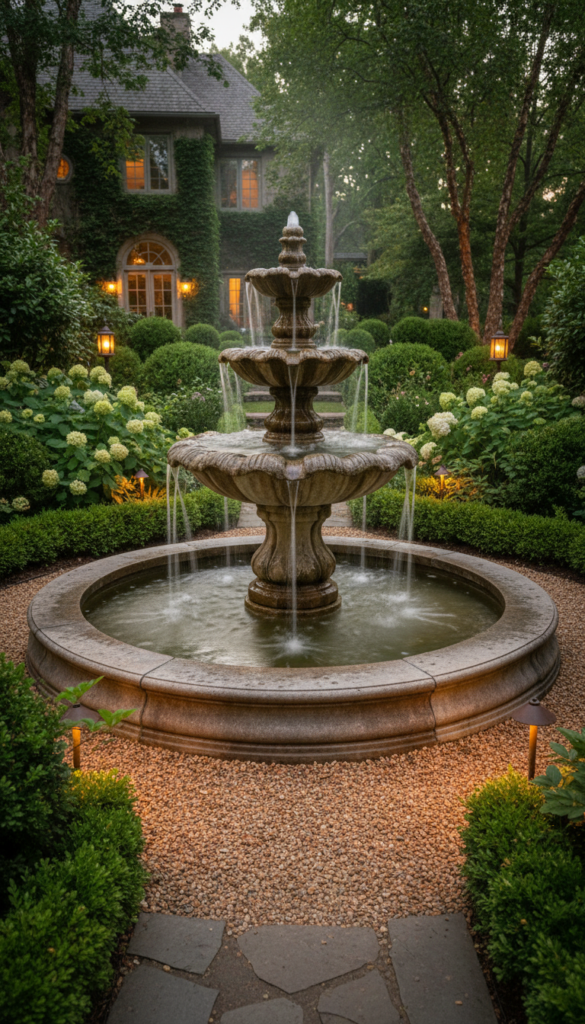 If your garden has any oomph, a tiered stone garden fountain gives off timeless vibes that feel elegant without being stiff. Think classic stone bowls stacked like a gentle waterfall — it’s a backyard styling move that says you care about details without trying too hard. The sound of water tumbling down tiers instantly upgrades the ambiance, making your garden the go-to chill zone after work. Style it with flowering shrubs and a gravel ring base for extra texture and visual interest. Classic, budget-friendly, and beloved for the soothing soundtrack it adds to outdoor living. (Garden.eco)