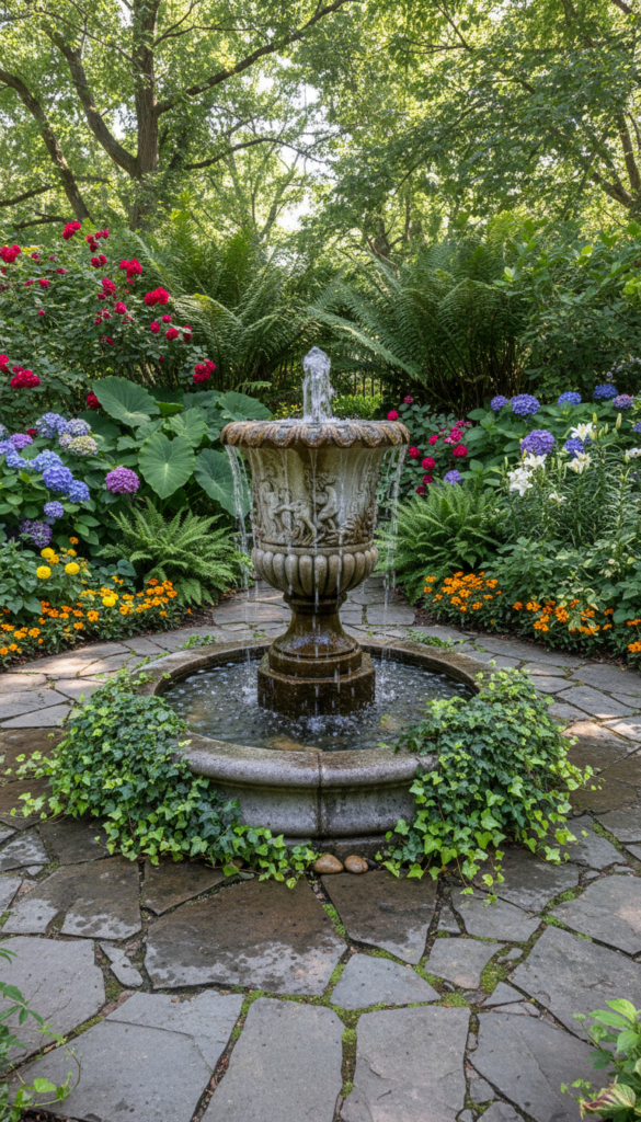 An urn fountain styled with plants is like giving your garden decor a power combo of water plus greenery. Fill the urn with creeping vines or trailing flowers that spill over the sides while water trickles down — it’s dual-purpose and surprisingly lush. This plays nicely with cottage or Mediterranean themes and looks especially good framed by potted herbs or stone pathways. The best part? It’s decorative even when the pump isn’t running, so it works as a sculptural piece too. Wonderful for patios that want laid-back luxury. (Garden.eco)