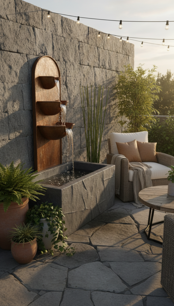 Make a vertical water feature your patio’s new focal point with a wall-mounted copper cascade fountain. These sleek designs are all the rage in 2025 outdoor decor ideas for small patios because they don’t steal precious floor space but still add sound and interest. Copper naturally develops a lovely patina over time — that aged character makes the space feel lived-in and thoughtful. Place it on a textured stone or brick wall, and suddenly your outdoor seating feels like a Mediterranean escape. People love this for its easy install and dramatic look that doesn’t overwhelm a tiny outdoor area. (milorien.com)