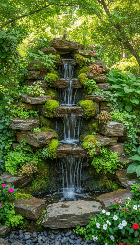 Natural stone lovers, this one’s for you: a waterfall rock fountain that mimics a little mountain stream right in your backyard. Stacking rugged stones and letting water cascade creates texture, movement and a very natural feel. Place near tall plants or moss beds to make it seem like it’s always been there. Outdoor decor ideas like this bring an almost forest-retreat energy to your space, and it’s a favourite for people who want that rustic, nature-inspired look. (PlusMood)