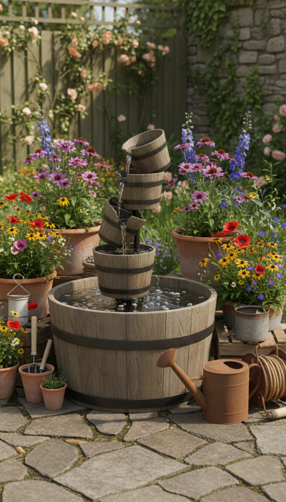 For that earthy, cozy backyard vibe that screams homegrown charm, a wooden tub fountain is an easy DIY that feels like something straight out of a craftsman magazine. Grab an old wooden barrel or tub, add a decent pump, and you have yourself an attention-grabbing centerpiece. The texture of the wood pairs beautifully with greenery and creeping vines, and you don’t need a huge budget to pull this off. My opinion? Rustic pieces like this add so much personality — especially when paired with simple wildflowers and natural stone accents. A total crowd-pleaser for patios that want character over flash. (Home Decoric – Innovate Your Space)