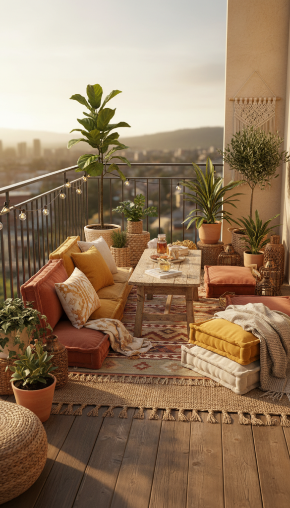 Floor seating changes everything. It makes your balcony feel relaxed, intimate, and a little artistic. Think low tables, soft cushions, and greenery surrounding you like a hug.