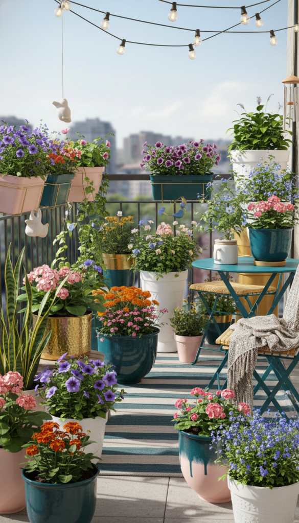 People love this style because it feels cheerful and expressive. It is perfect if your balcony needs energy instead of calm. Also, colorful pots photograph beautifully, which is always a bonus.