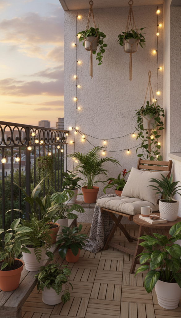 String lights are the fastest glow up tool in the history of outdoor decor ideas. The second you hang them, your balcony stops looking like an extension of the laundry area and starts feeling like a mini outdoor lounge. Warm lights work best because they make everything look softer and more expensive. Even basic plants suddenly feel styled when they are lit properly.