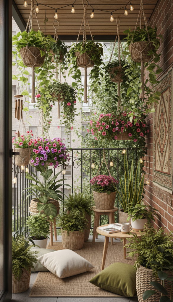 If your balcony feels tiny, hanging plants will change everything. They draw the eye upward and make the space feel taller and fuller. Suddenly, your balcony looks like a little jungle instead of a narrow strip of concrete. And yes, it feels magical every time you step outside.