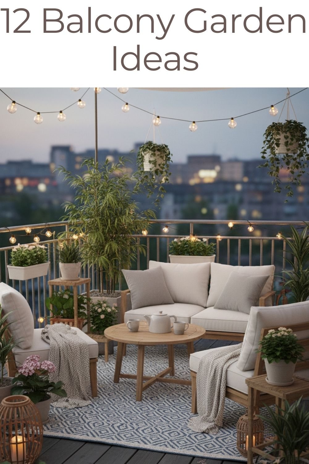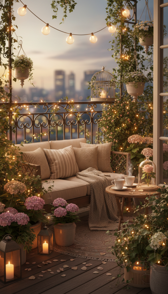 “romantic balcony garden with fairy lights around plants and railings, cozy seating, soft evening glow, dreamy outdoor decor”