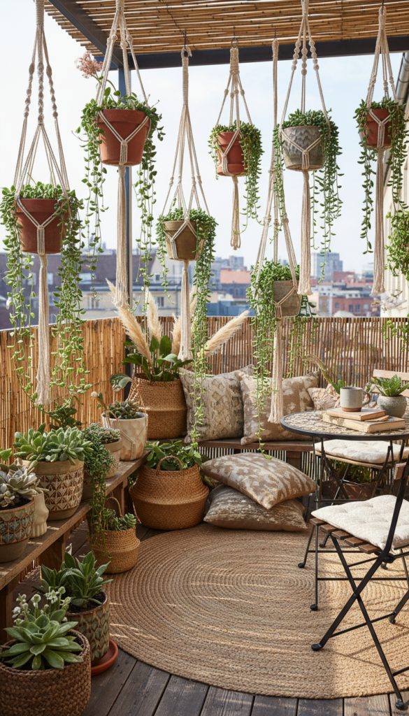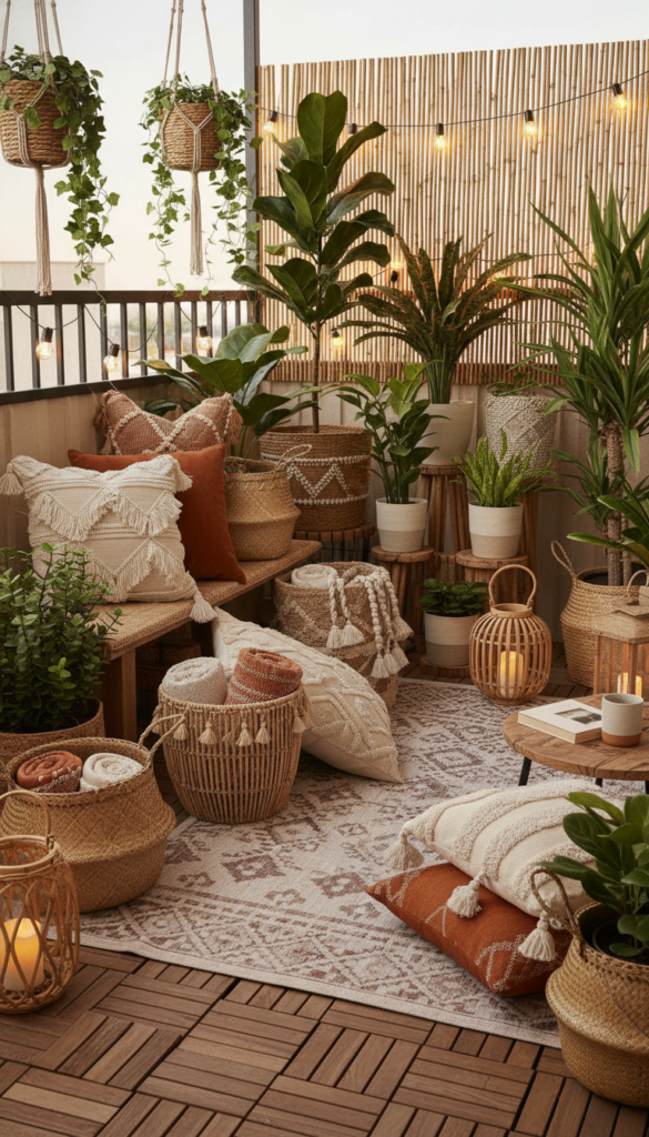 “cozy boho balcony corner with woven baskets, textured cushions, outdoor rug, mixed plants at different heights, warm lighting, balcony garden decor”