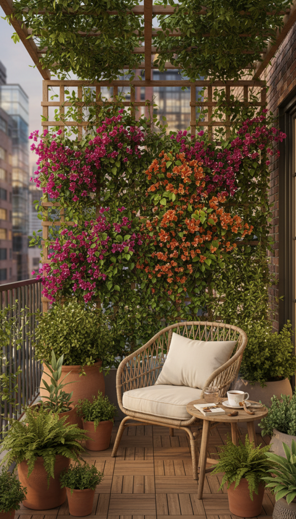 “balcony with green privacy canopy made of climbing vines on trellis, leafy screen, flowering bougainvillea, cozy city balcony garden”