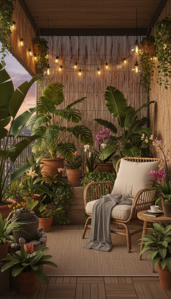 “tropical balcony garden with bamboo screen, large leafy plants, rattan chair, warm lighting, lush green outdoor escape, urban apartment balcony decor”