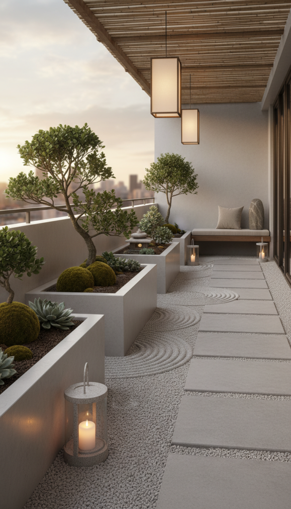 “minimalist zen balcony garden with clean planter lines, calming tones, simple lanterns, peaceful outdoor decor”