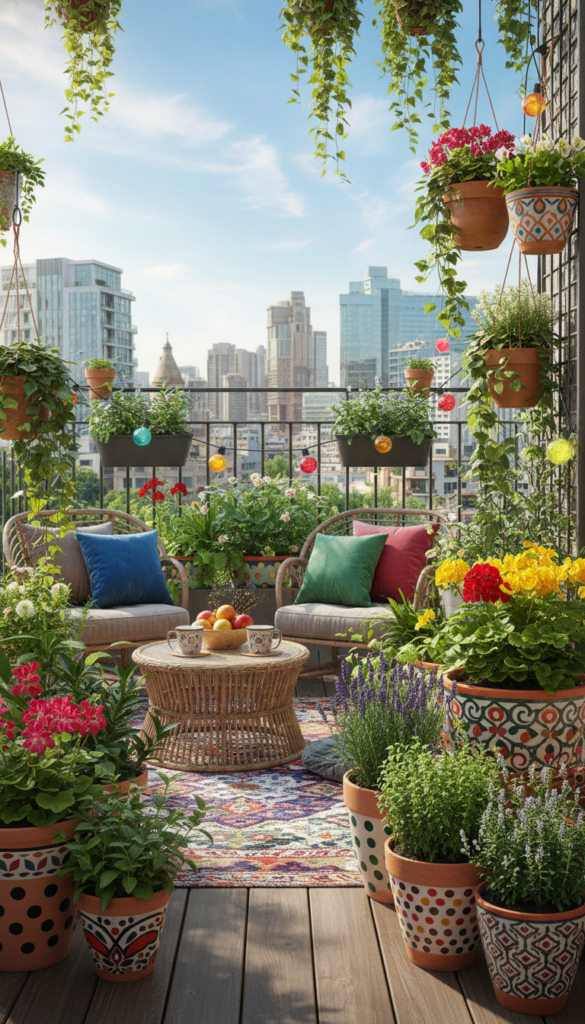 “balcony with vibrant patterned pots and lush plants, colorful outdoor decor, stylish urban balcony garden”