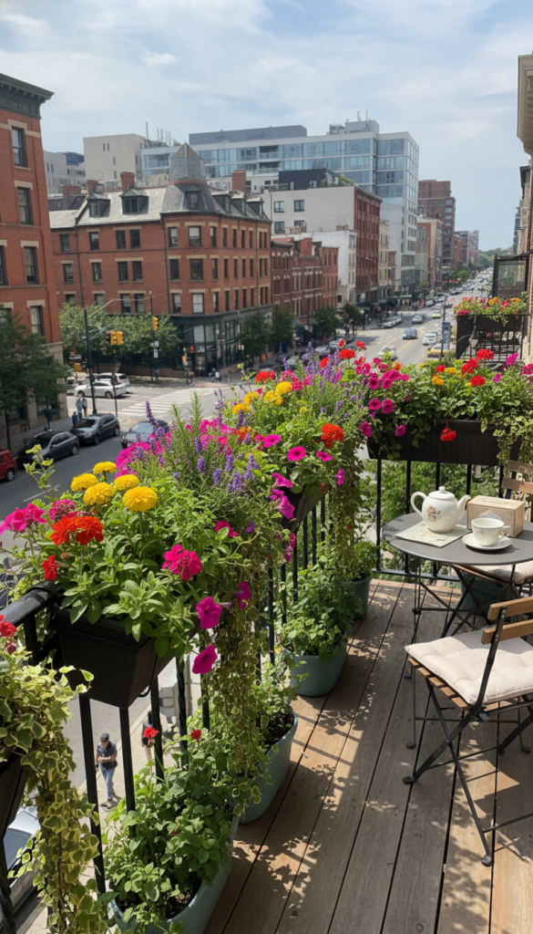 “balcony railing garden with planter boxes filled with colorful flowers and herbs, lively urban balcony greenery”