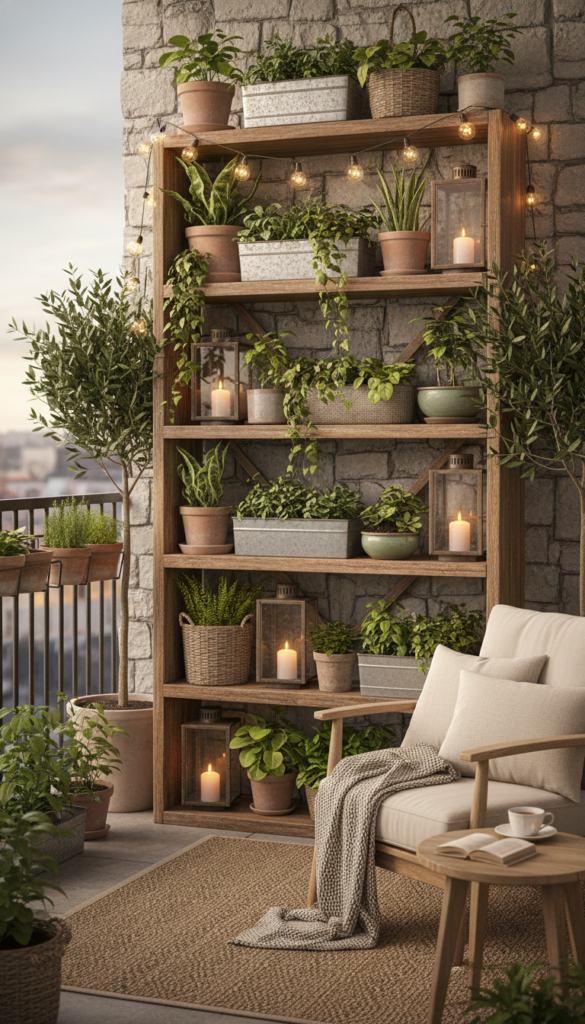 “balcony garden with rustic wooden shelves filled with plants and lanterns, mixed planter shapes, warm outdoor decor”
