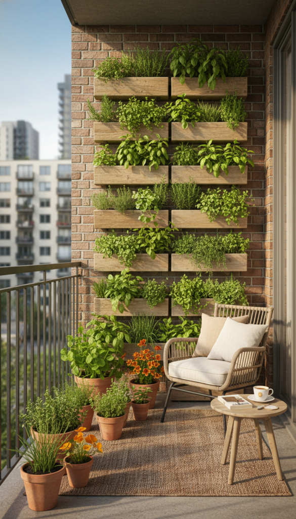 “small balcony with vertical herb garden on a wall, mixed planters of basil, mint, rosemary with sunlight, cozy outdoor decor, urban apartment balcony, high-detail plants and pots”