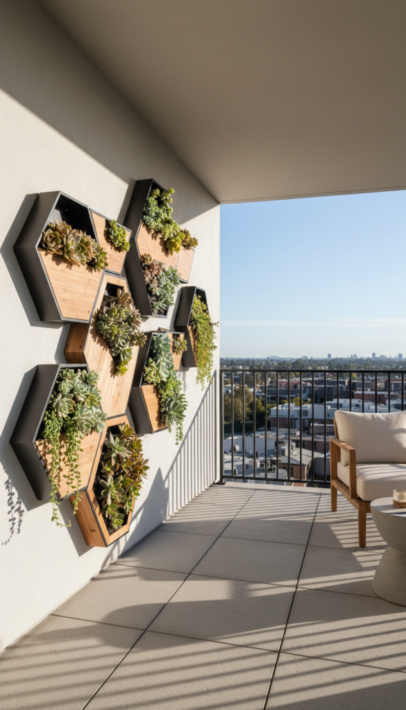 Think of this as art meets garden decor. These geometric planters — hexagons, triangles, you name it — create a modern pattern on your wall that doubles as plant homes. Succulents, trailing pothos, and mini ferns pop in these shapes.