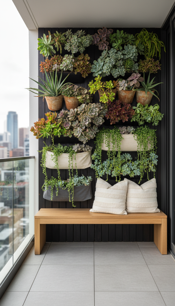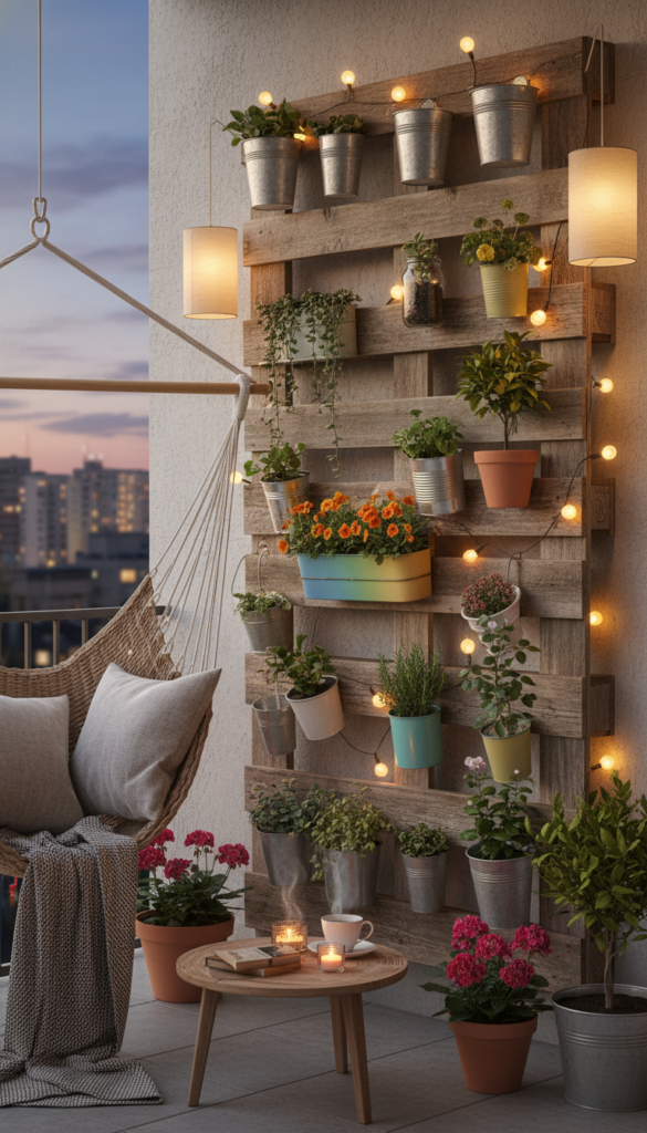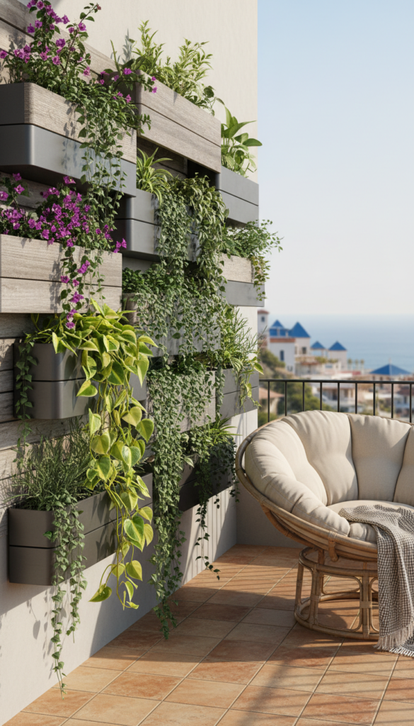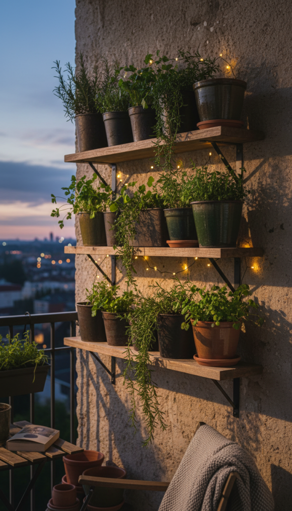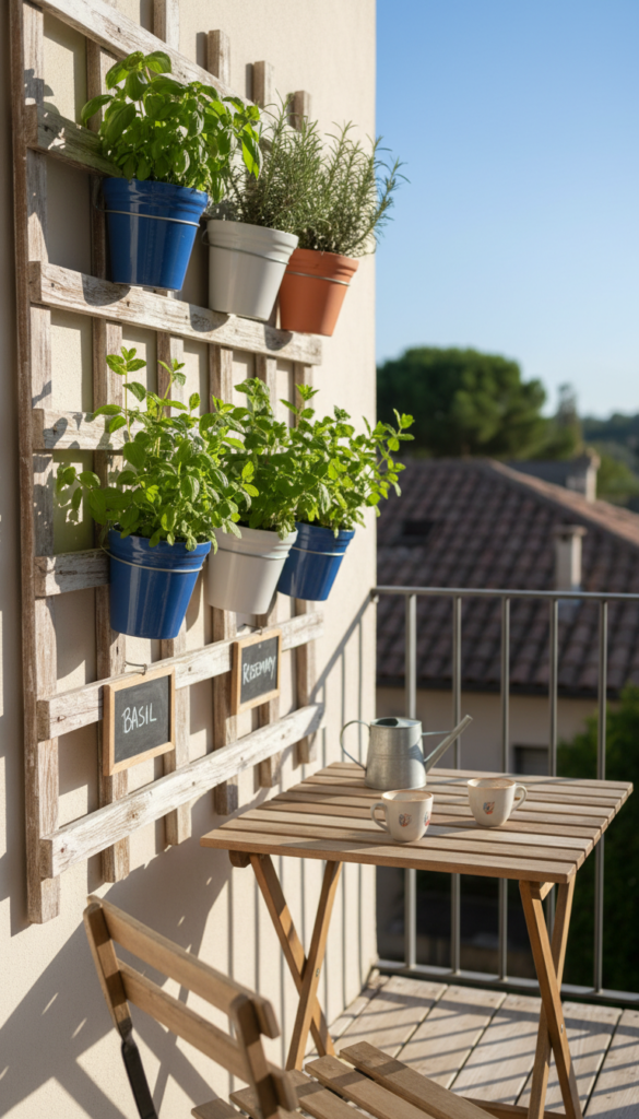 This one’s both cute and useful. A herb wall lets you grow fresh basil, mint, rosemary, and more right on your balcony wall — and chalk labels on each planter turn it into a chic edible display. Herb gardens thrive in vertical setups, especially where space is limited.