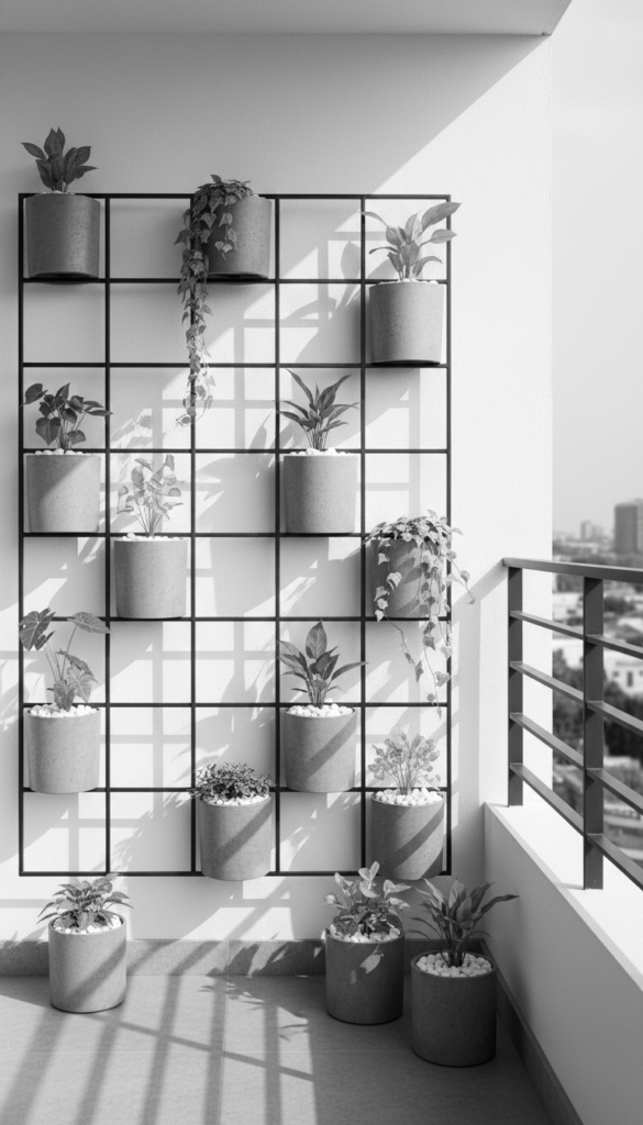 Here’s for the sleek lovers. A minimalist monochrome plant grid keeps everything colour-coordinated — black metal grid, grey planters, white pebbles — for that calm, minimalist aesthetic.