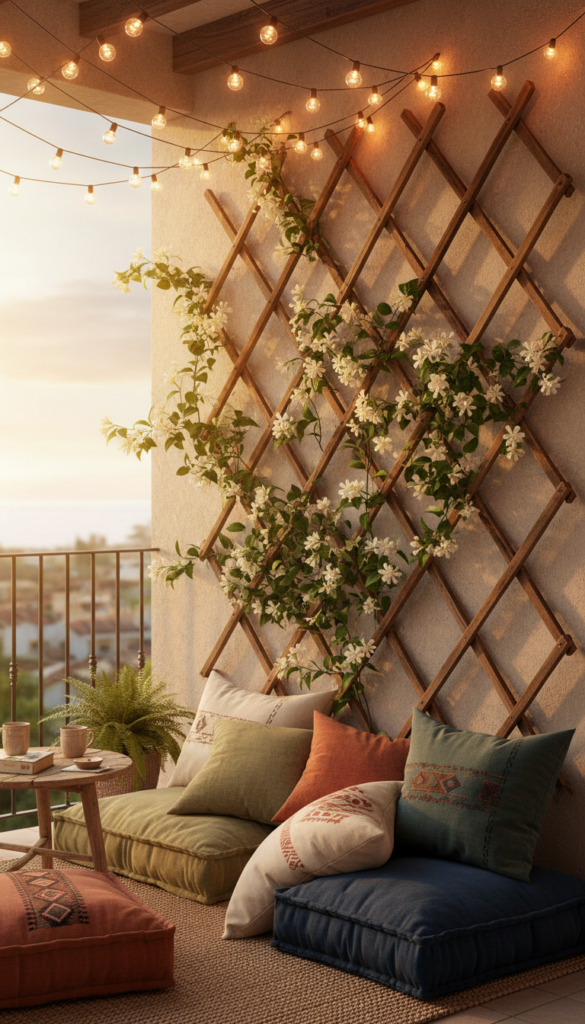 Is it even a garden if there’s no leafy drama growing up the wall? A trellis with climbing creepers is like giving your balcony the “green curtain” it secretly wanted. Install a slim wooden or metal trellis against the wall and train plants like jasmine, ivy, or bougainvillea up it.