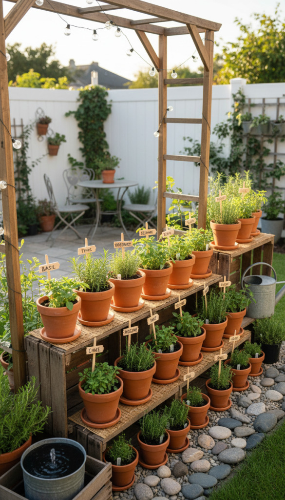 Use raised beds, crates, or matching pots. Keep labels simple and cohesive. Place them near seating or kitchens for easy access.