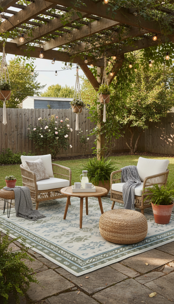 People love outdoor rugs because they add comfort instantly. It is backyard styling that feels cozy and practical at the same time.